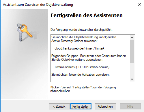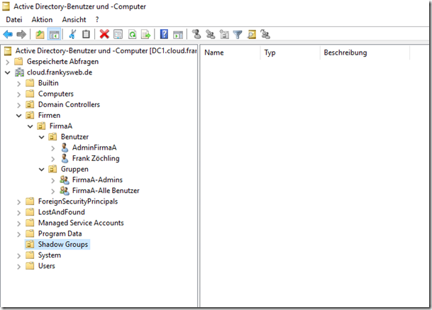 For later tests, I have assigned the "AdminFirmaA" account to the "FirmaA-Admins" group.