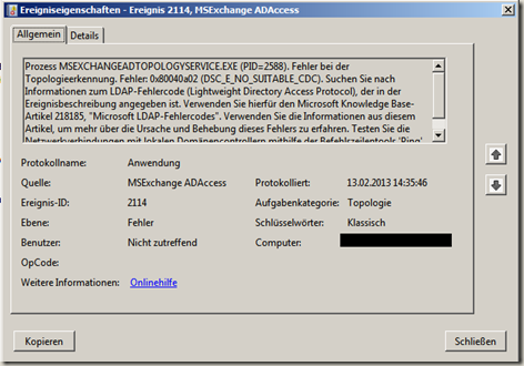 Process MSEXCHANGEADTOPOLOGYSERVICE.EXE (PID=2588). Error during topology detection. Error: 0x80040a02 (DSC_E_NO_SUITABLE_CDC). Search for information on the LDAP error code (Lightweight Directory Access Protocol) specified in the event description. Use the Microsoft Knowledge Base article 218185 for this,