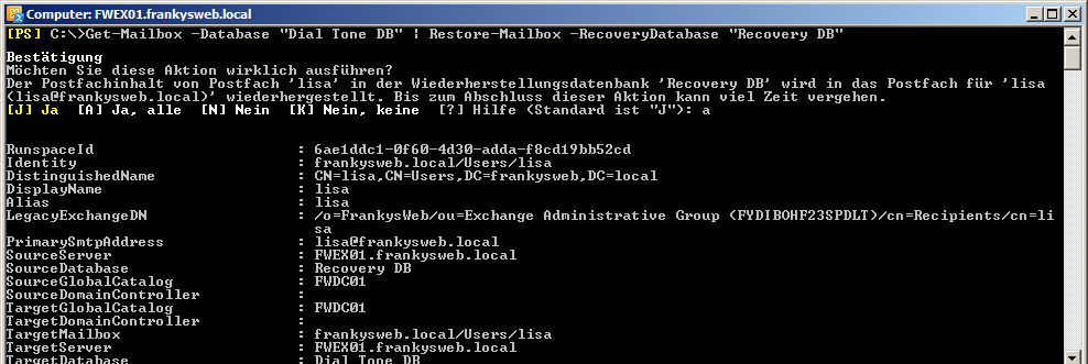 Now we can synchronize the data of the Recovery DB (which was our transition database) with the new productive database "Dial Tone DB"