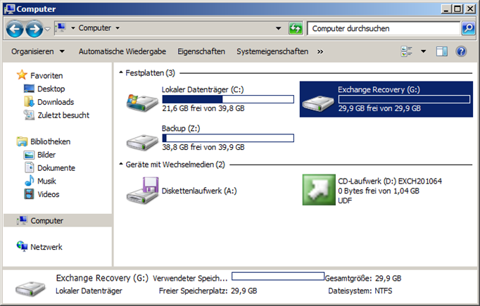 Of course, the database cannot be restored without a functioning backup, so I back up the H: drive with the "Windows Server Backup" once to the Z drive. I only use the drive to store the backup there. Of course, the backup can also be performed with any other Exchange-compatible backup software. I use the Windows Server backup because it is supplied with the operating system and fulfills its purpose for this test. I will write a separate article on backing up and restoring with Windows Server Backup.