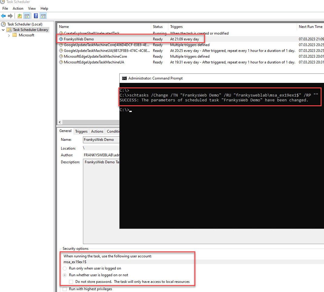 schtasks /Change /TN "FrankysWeb Demo" /RU "frankysweblab\msa_ex19ex1$" /RP ""