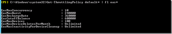 The number of ActiveSync devices per mailbox can be limited via throttling policy. To display the ActiveSync settings of the default throttling policy, the command below can be entered.