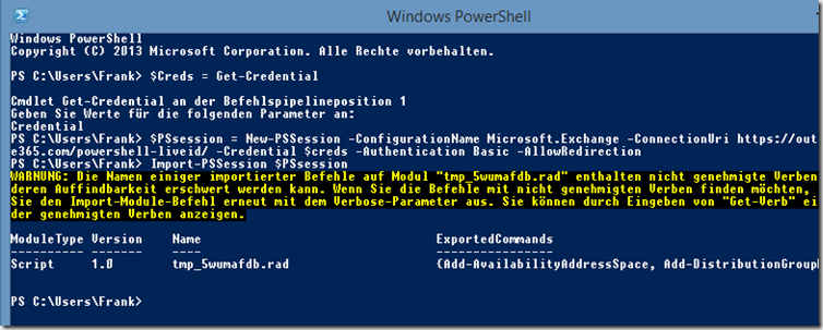$Creds = Get-Credential $PSsession = New-PSSession -ConfigurationName Microsoft.Exchange -ConnectionUri -Credential $creds -Authentication Basic -AllowRedirection Import-PSSession $PSsession
