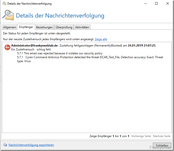 Die Nachrichtenverfolgung gibt den First-Level sofort Auskunft über die Fehlerquelle einer nicht zugestellten Mail.