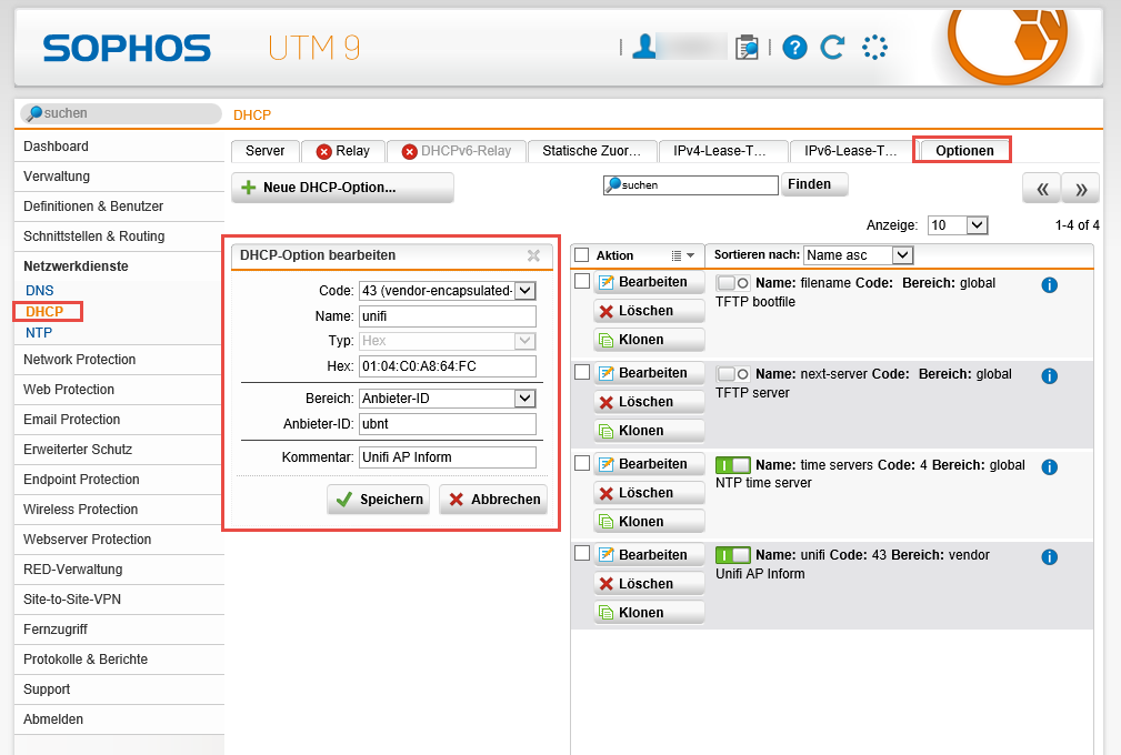 Sophos UTM: DHCP Option 43 for UniFi AccessPoints