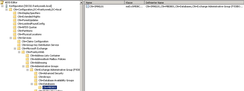 Die Vorgehensweise: Zuerst habe ich die Datenbank Container via ADSI-Editor gelöscht. Exchange lässt das Löschen von Datenbanken nicht zu, solange noch Postfächer in der Datenbank vorhanden sind, also musste dieser Schritt per ADSI-Editor erledigt werden. Ich habe also den Eintrag “CN=MBDB01” gelöscht.