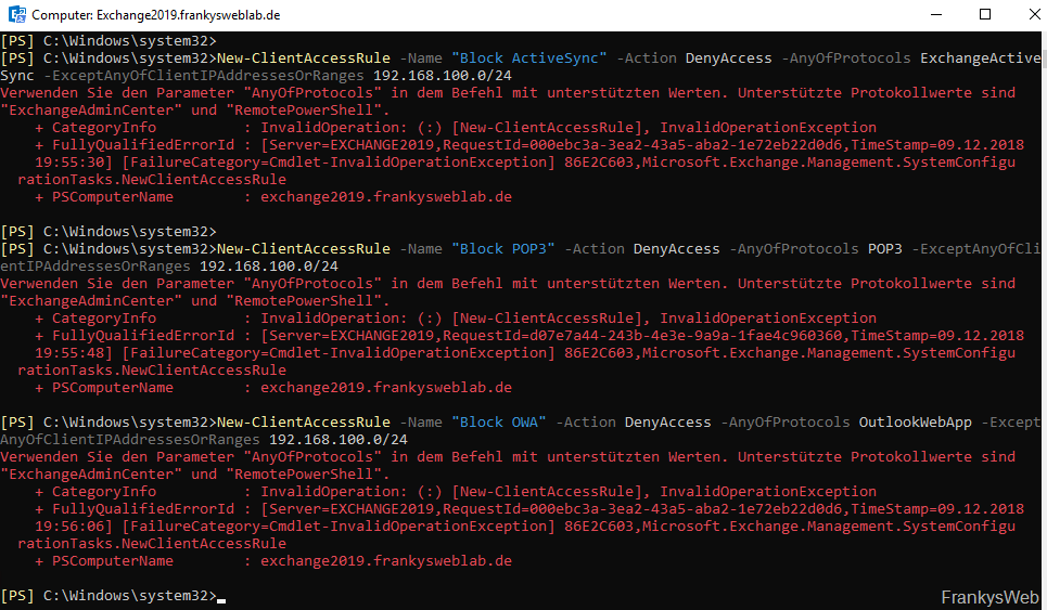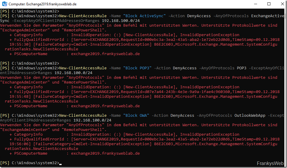 Wie bereits erwähnt lassen sich derzeit nur RemotePowerShell und ExchangeAdminCenter mit Client Access Rules verwalten. Der Versuch andere Protokolle bzw. Schnittstellen zu verwalten schlägt mit Exchange 2019 RTM fehl: