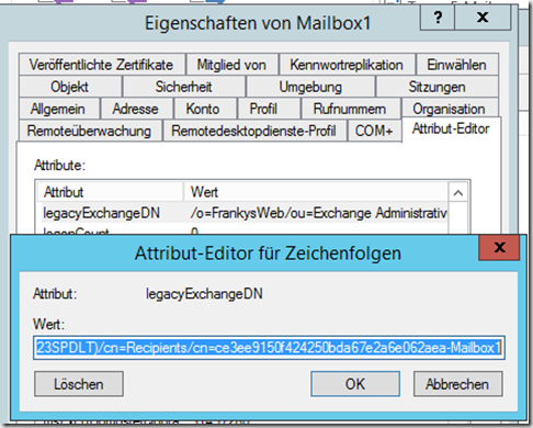 Sobald sich nun der LegacyExchangeDN ändert, weil das Postfach nun in einer neuen Gesamtstruktur liegt, zum Beispiel auf: